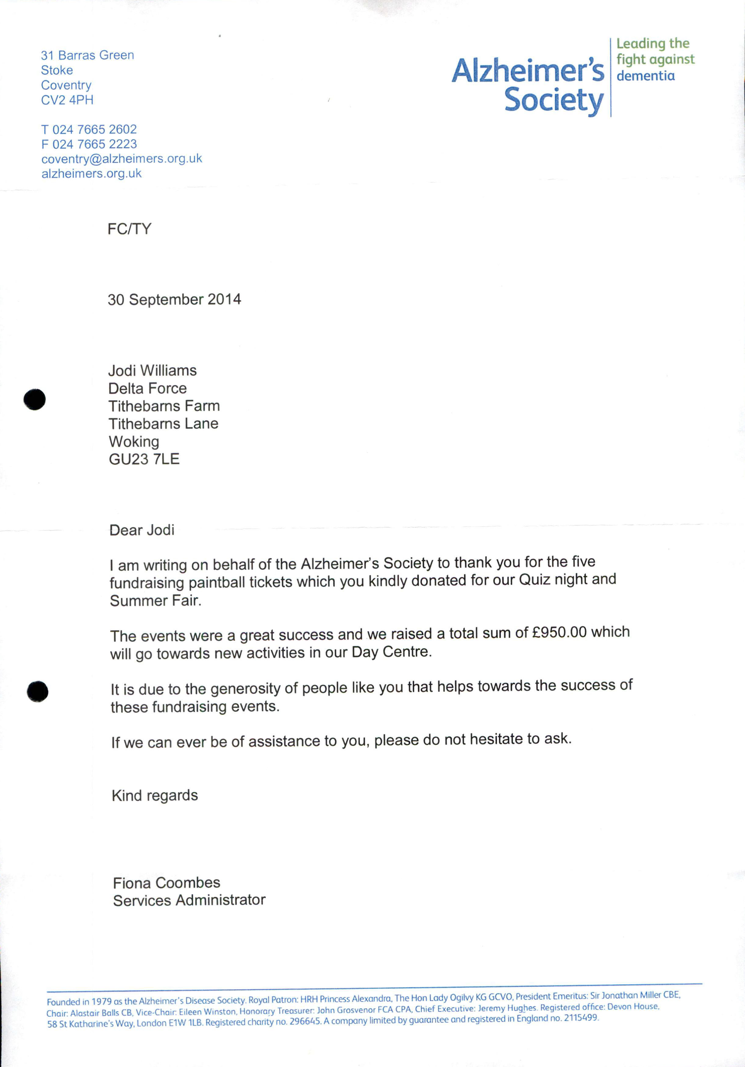 I am writing on behalf of the Alzheimer’s Society to thank you for the five fundraising paintball tickets which you kindly donated for our Quiz night and Summer Fair.