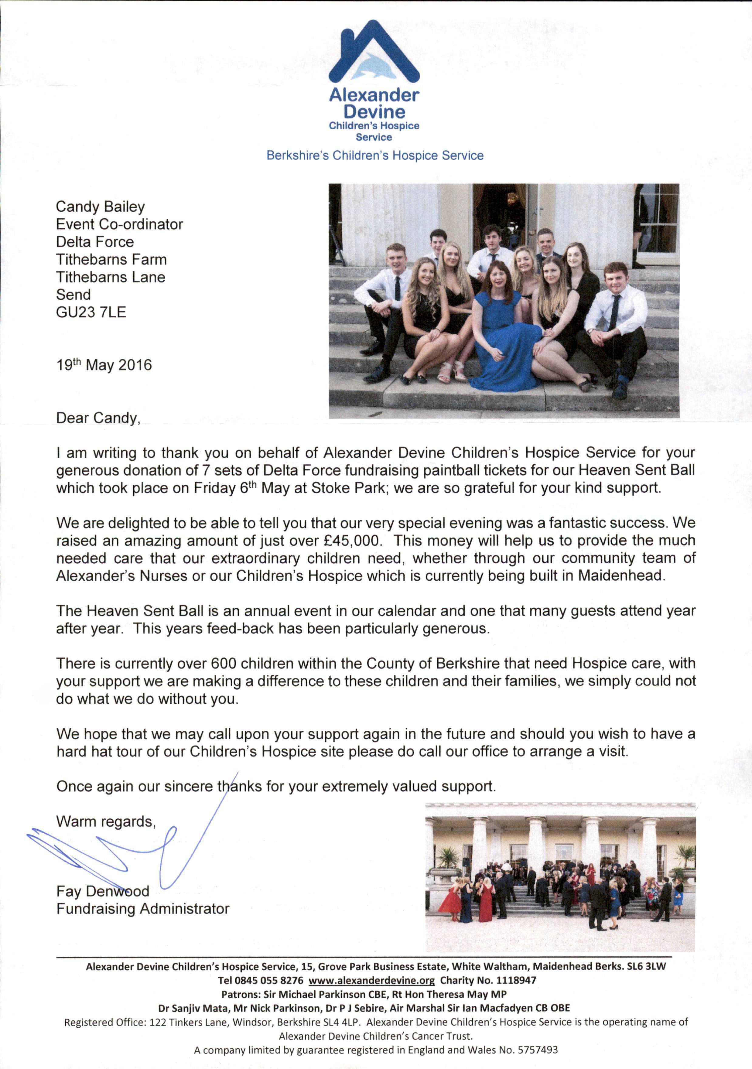 I am writing to thank you on behalf of Alexander Devine Children’s Hospice Service for your