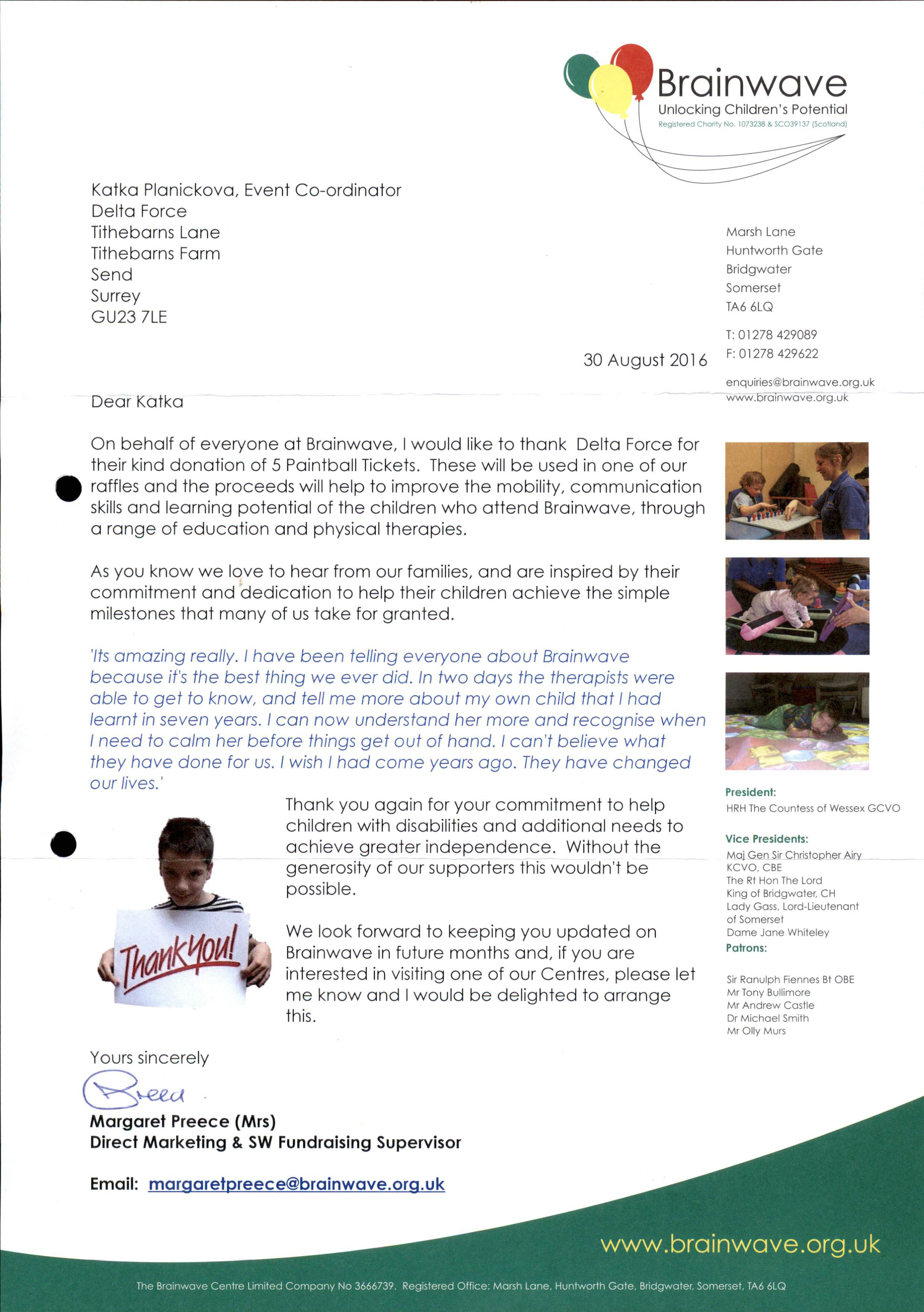 On behalf of everyone at Brainwave, I would like to thank Delta Force for their kind donation of 5 Paintball Tickets. These will be used in one of our raffles and the proceeds will help to improve the mobility, communication skills and learning potential of the children who attend Brainwave, through a range of education and physical therapies.