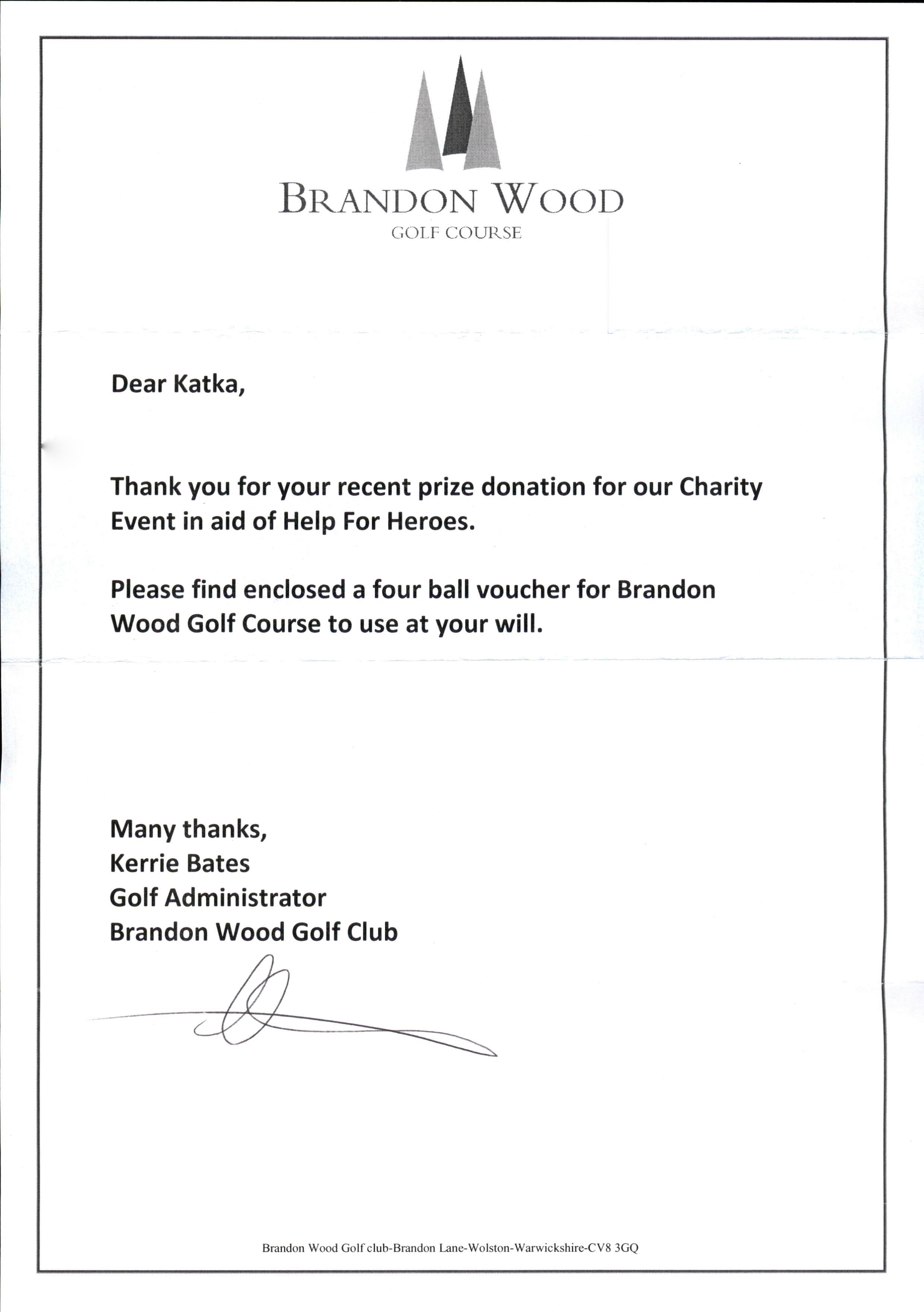 Please find enclosed a four ball voucher for Brandon Wood Golf Course to use at your will.
