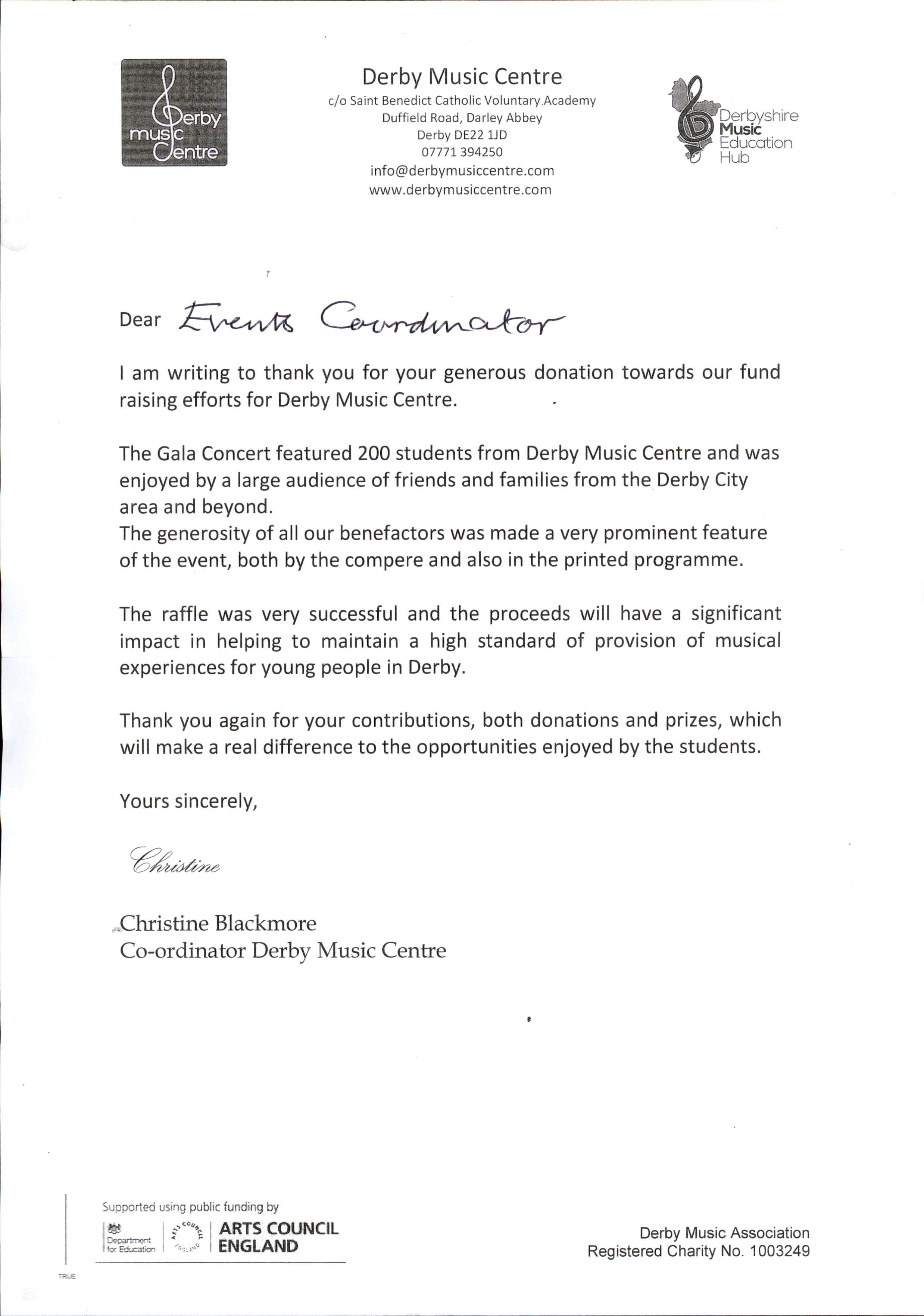 I am writing to thank you for your generous donation towards our fund raising efforts for Derby Music Centre.