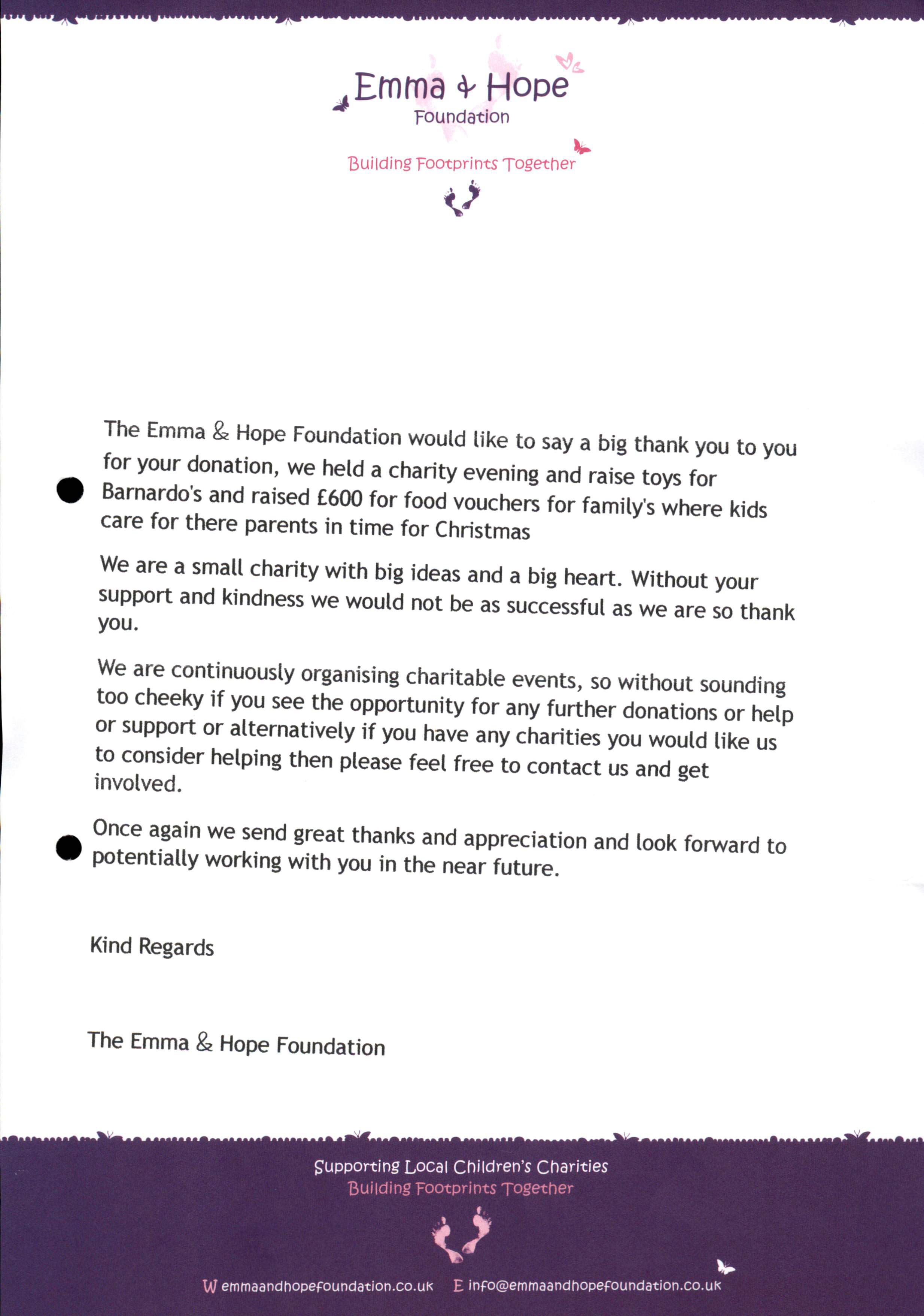 The Emma & Hope Foundation would like to say big thank you to you for your donation, we held a charity evening and raise toys for barnardo’s and raised £600 for food vouchers for family’s where kids care for their parents in time for Christmas.