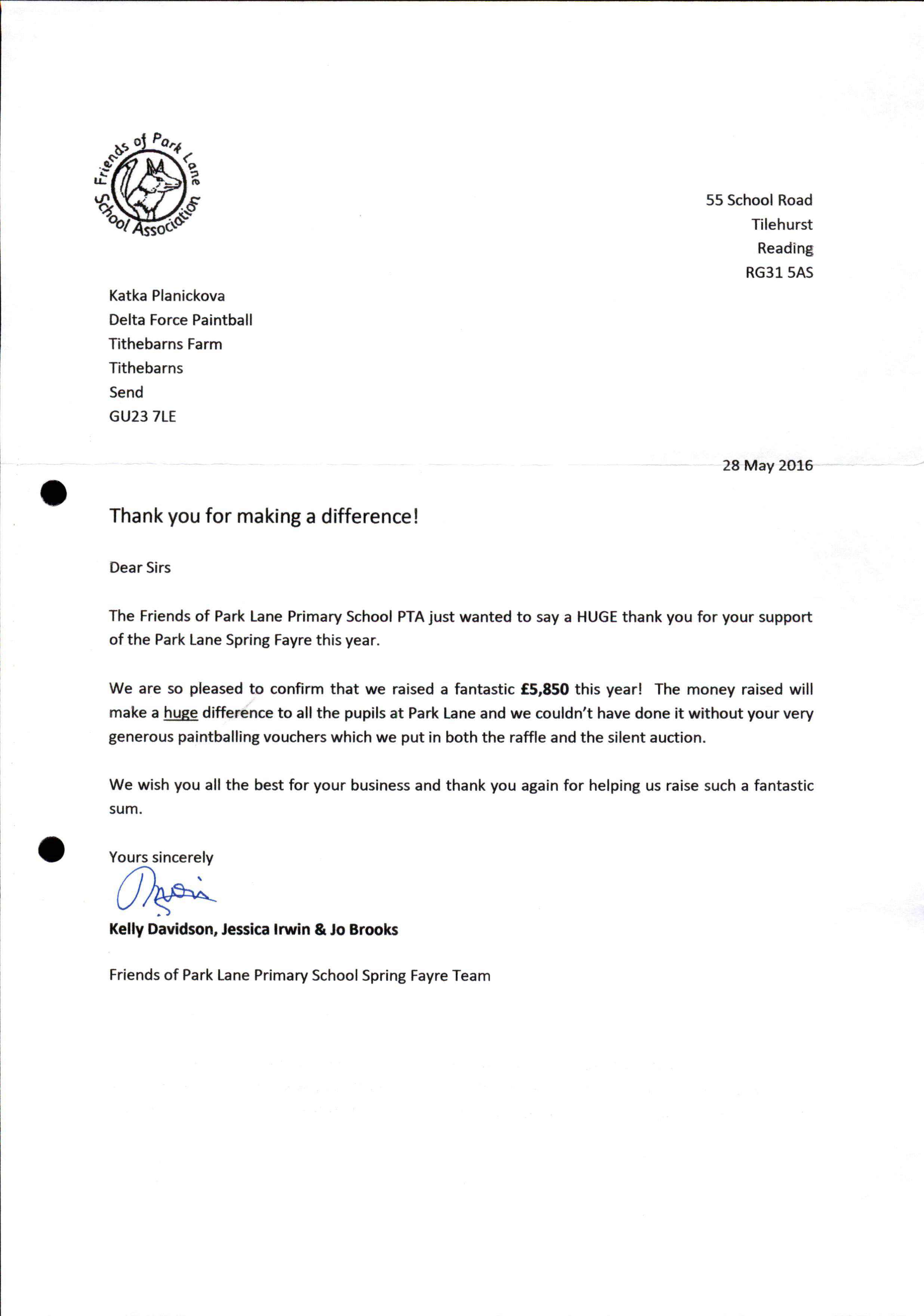 We are so pleased to confirm that we raised a fantastic £5,850 this year! The money raised will make a huge difference to all the pupils at Park Lane and we couldn’t have done it without your very generous paintballing vouchers which we put in the both the riffle and the silent auction.
