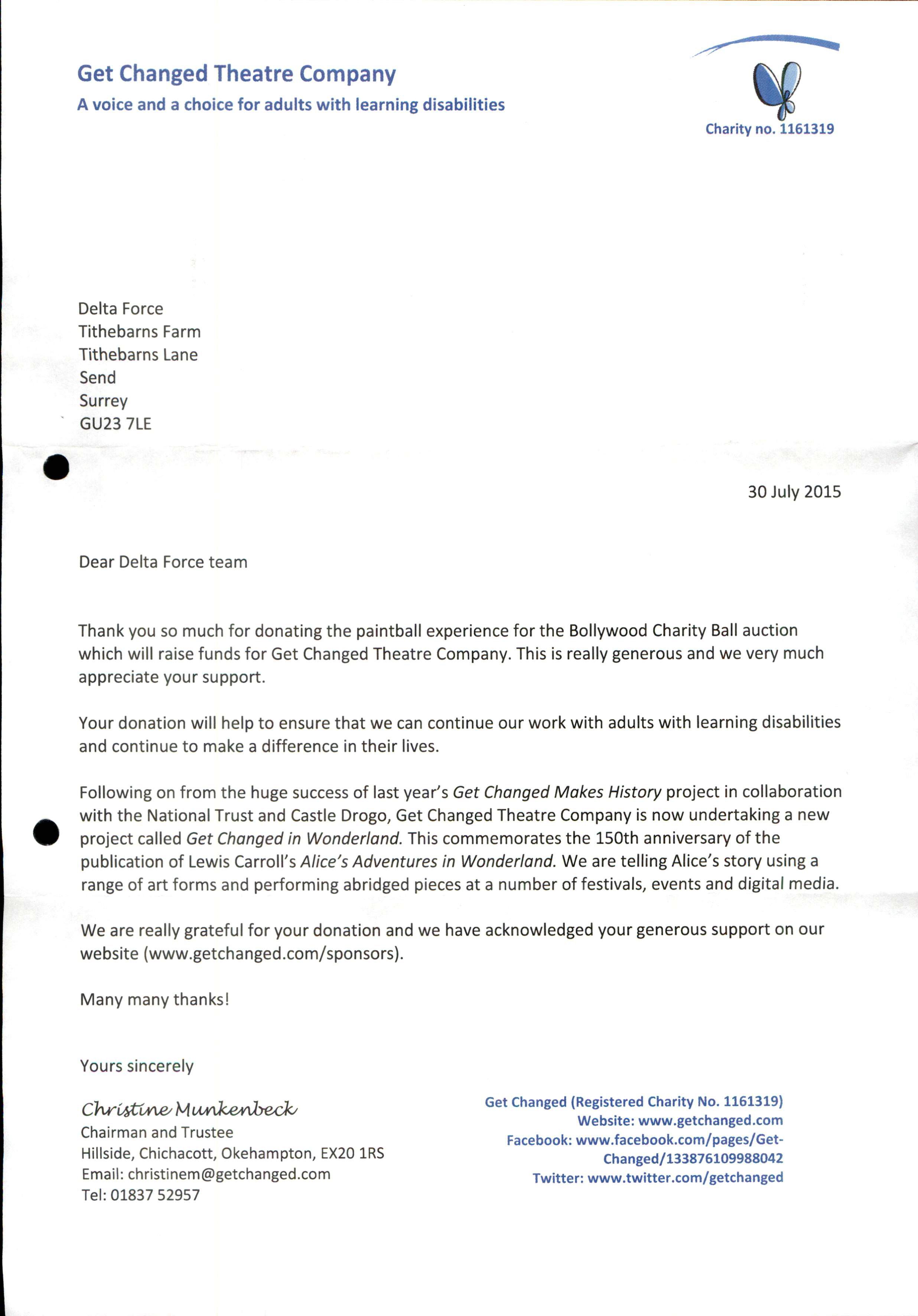 Thank you so much for donating the paintball experience for the Bollywood Charity Ball auction which will raise funds for Get Changed Theatre Company. This is really generous and we very much appreciate your support.