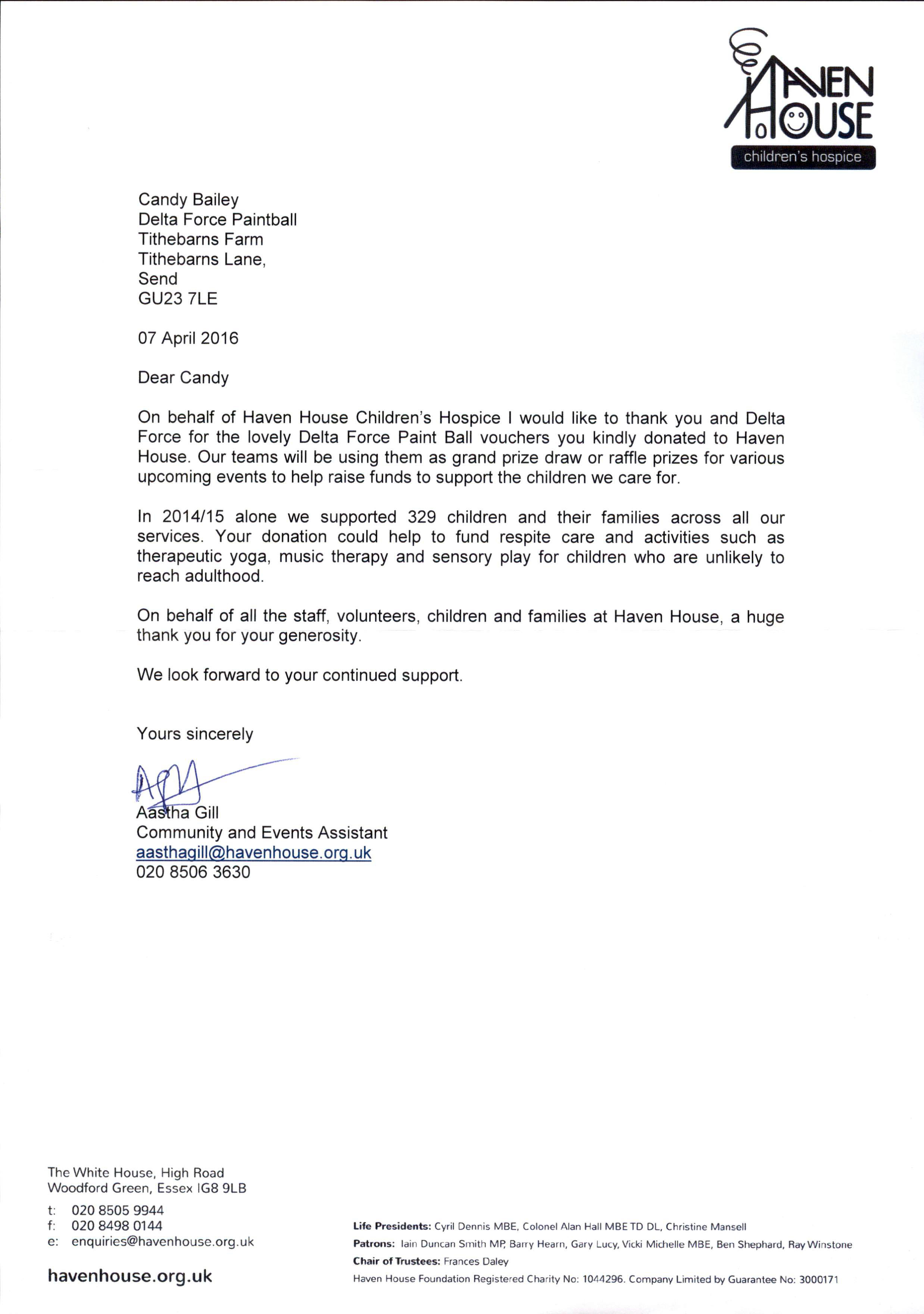 On behalf of Haven House Children’s Hospice I would like to thank you and Delta Force for the lovely Delta Force Paint Ball vouchers you kindly donated to Haven House. Our teams will be using them as grand prize draw or raffle prices for various upcoming events to help raise funds to support the children we care for.