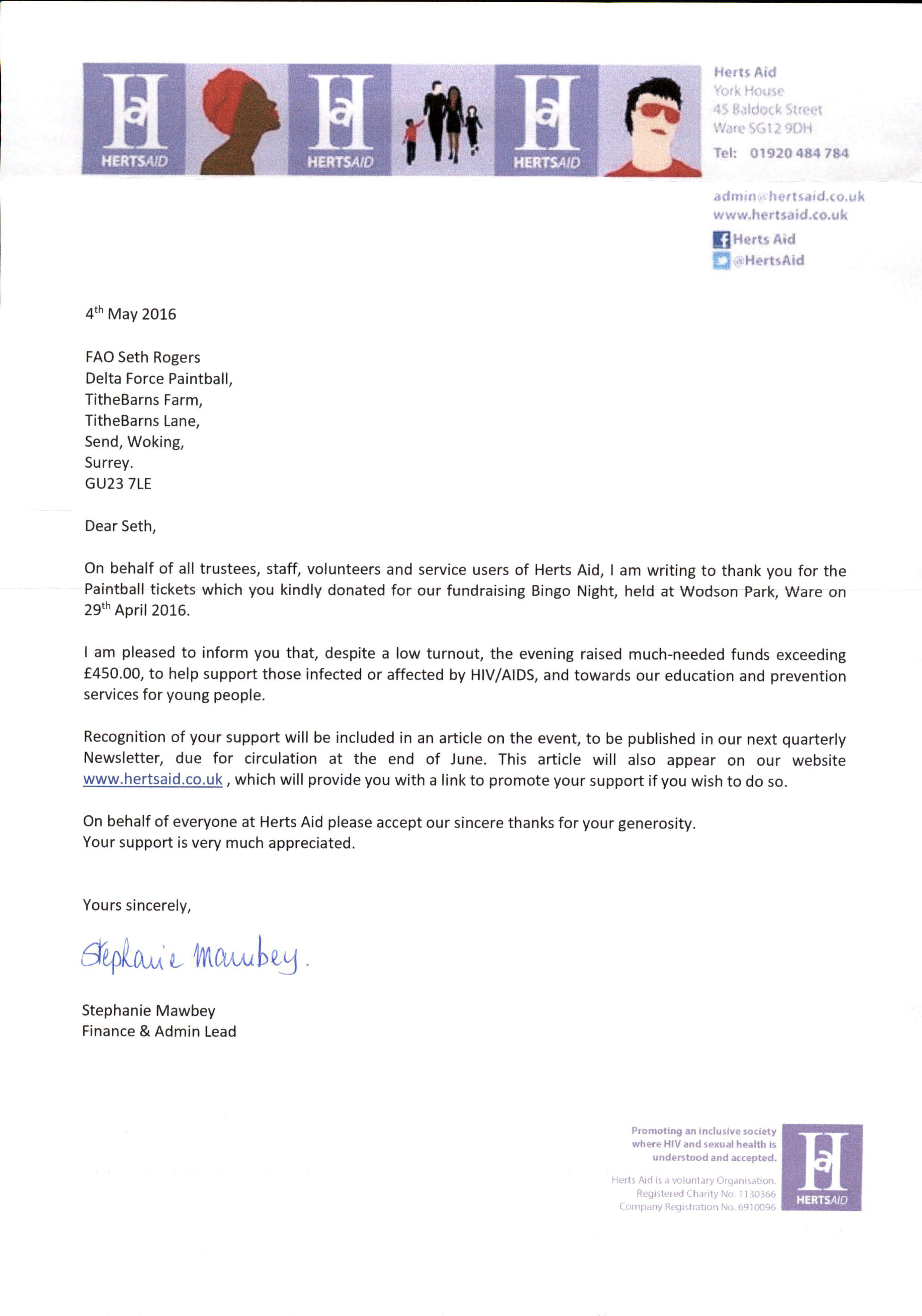 On behalf of all trustees, staff, volunteers and services users of Herts Aid, I am writing to thank you for the Paintball tickets which you kindly donated for our fundraising Bingo Night, held at Wodson Park, Ware on 29th April 2016.