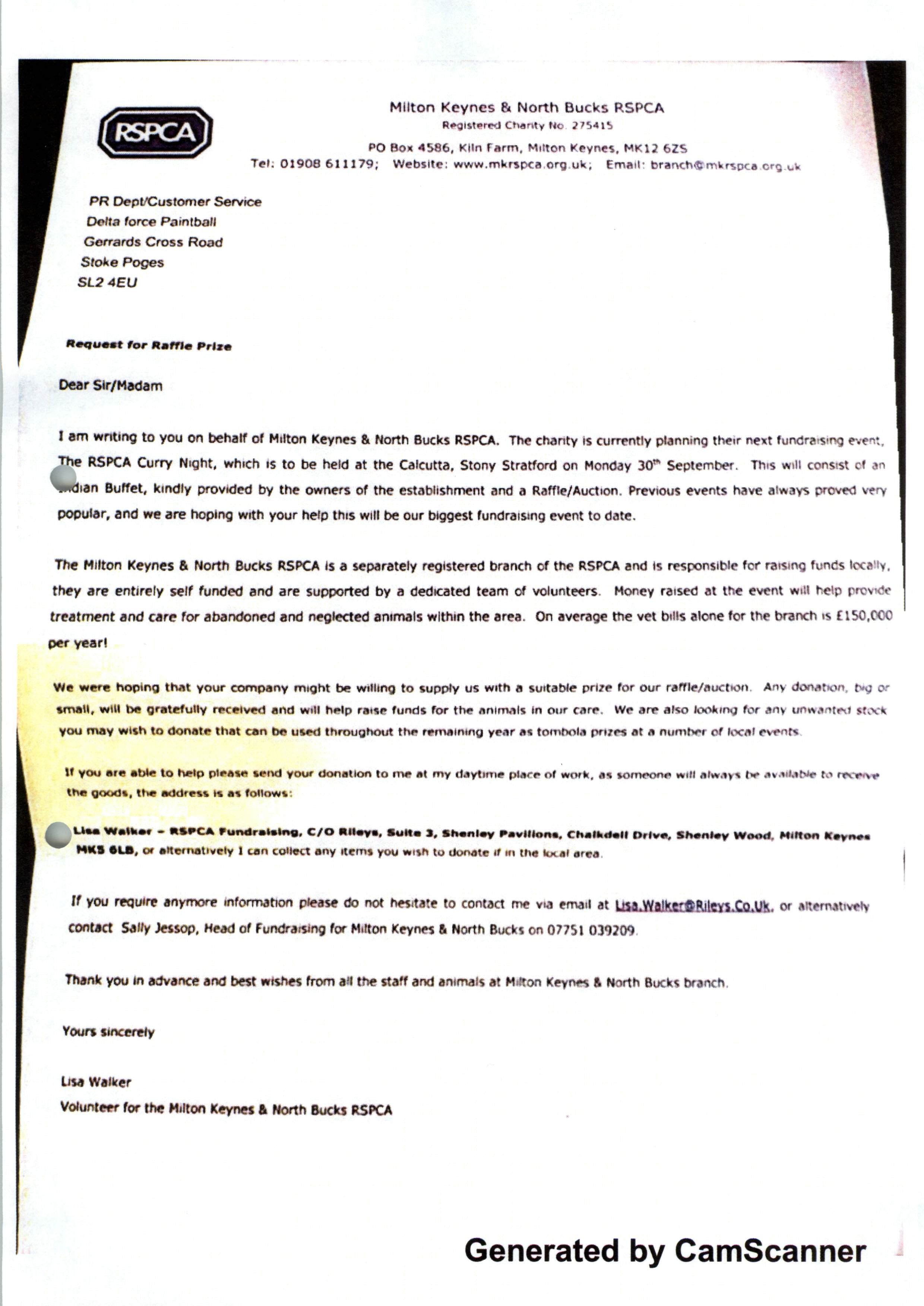 I am writing to you on behalf of Milton Keynes & North Bucks RSPCA. The charity is currently planning their next fund-raising event. The RSPCA curry Night, which is to be held at the Calcutta, Stony Stafford on Monday 30th September. This will consist of an Indian Buffet, kindly provided by the owners of the establishment and a Raffle/Auction. Previous events have always proved very popular, and we are hoping with your help this will be our biggest event to date.