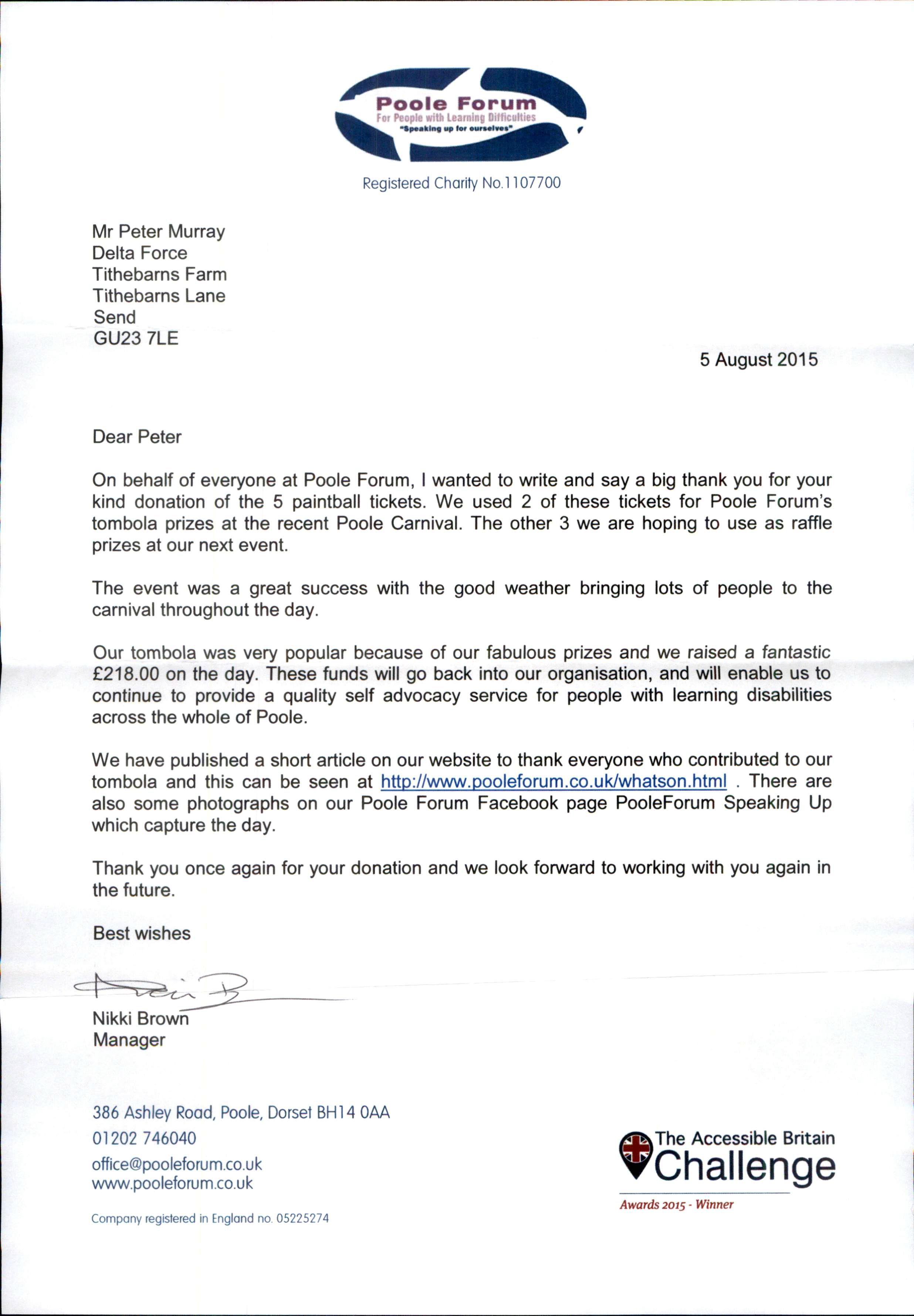 On behalf of everyone at Poole Forum, I wanted to write and say a big thank you for your kind donation of the 5 paintball tickets. We used 2 of these tickets for Poole Forum's tombola prizes at the recent Poole Carnival. The other 3 we are hoping to use as raffle prizes at our next event.