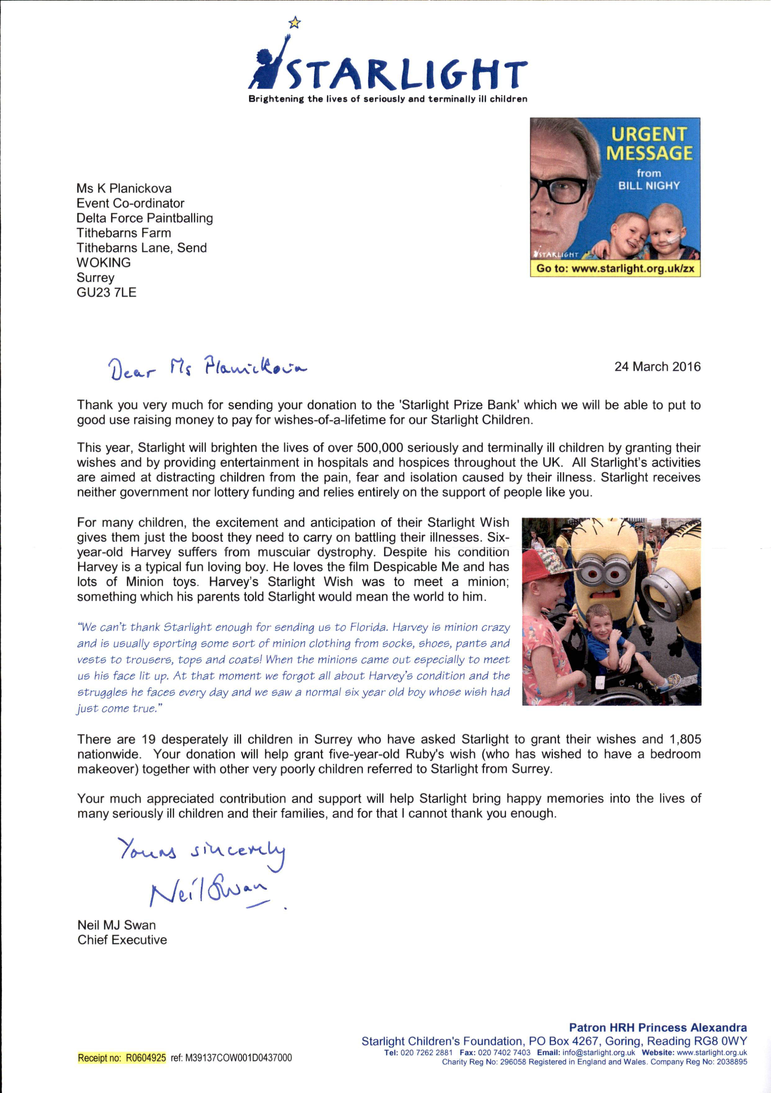 Thank you very much for sending your donation to the ‘starlight prize bank’ which we will be able to put to good use raising money to pay for wishes-of-a-lifetime for our starlight children.